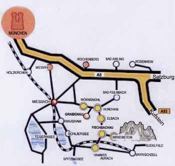 Sie fahren auf der A8 München/Salzburg und nehmen die Ausfahrt Weyarn. Folgen Sie der Beschilderung Richtung Miesbach/Fischbachau. Benutzen Sie anschließend folgende Skizze:
